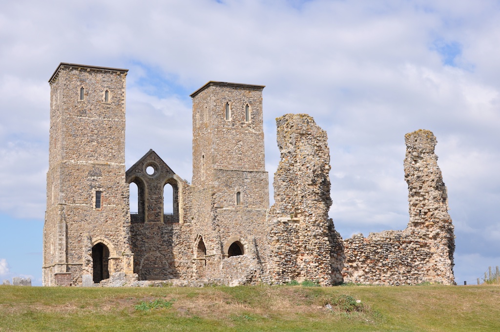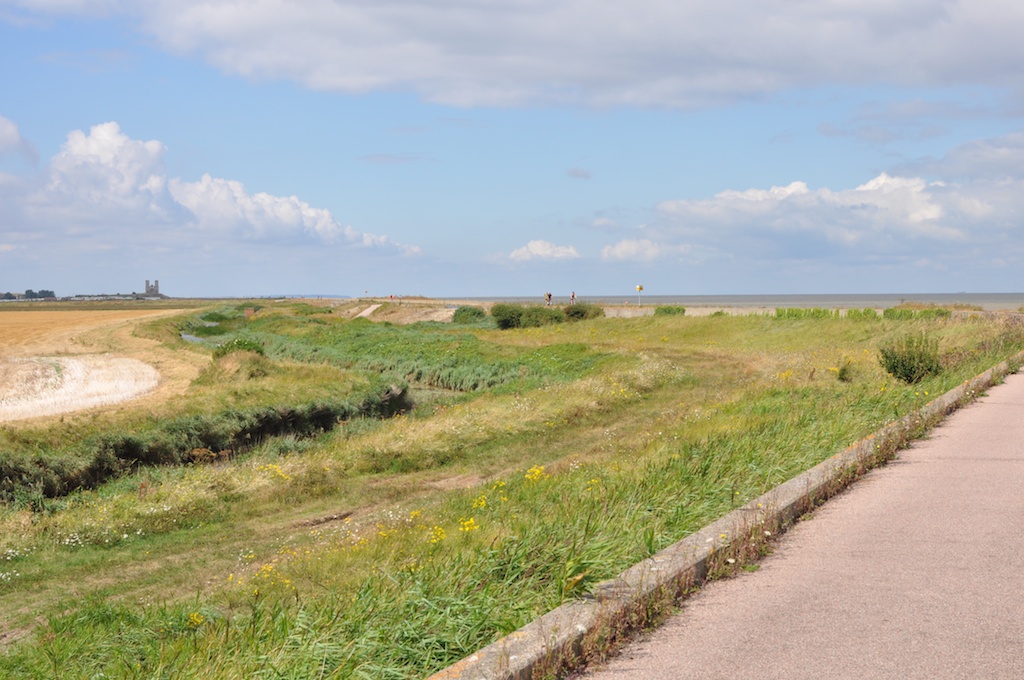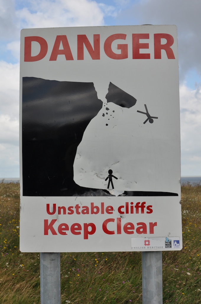 he route briefly goes up hill, through a small park and then sweeps down a reinforced grass path, past a great warning sign for unstable cliffs, towards the Reculver Towers.